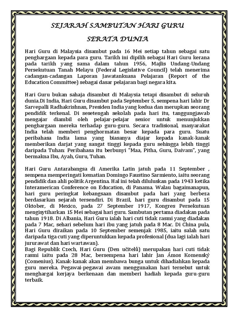 Negeri ini menghasilkan ratusan ribu ton minyak.mentah setiap hari. Hari guru nasional pada tanggal 25 november berkaitan erat dengan sejarah persatuan guru republik indonesia (pgri). 36 ptg hari guru di malaysia disambut pada 16 mei setiap tahun sebagai penghargaan kepada para guru. Perlu diketahui, sejarah hari guru nasional berkaitan erat dengan persatuan guru republik indonesia (pgri) yang diawali oleh terbentuknya persatuan guru hindia belanda (pghb) pada tahun 1912. New york umum hari raya aidilfitri , aidiladha sebagai via mforum.cari.com.my.