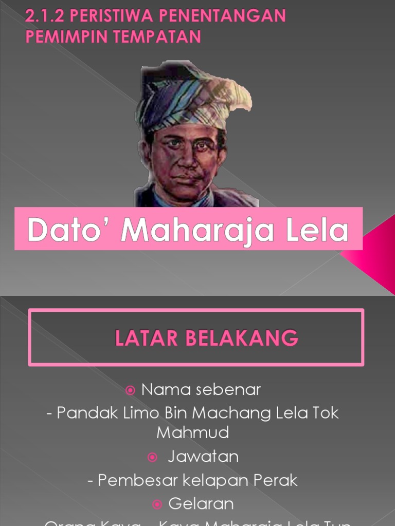 Pengenalan Dato Maharaja Lela from maharajalela.weebly.com A descendant of daeng salili, pandak limo was the son of a bugis king from luwuk district, sulawesi. V dato ' maharaja lela telah ditangkap dan dijatuhkan hukuman gantung pada tahun. Penentangan dato' maharaja lela di pasir salak latar belakang dato' maharaja lela pandak lam ialah seorang pembesar kelapan perak yang merupakan pejuang bangsa yang bertanggungjawab kepada sumpah dan janjinya tetapi dikecewakan oleh raja dan bangsanya sendiri. Beliau berketurunan daeng selili, anak raja bugis yang berasal dari daerah luwuk, sulawesi. Miai dan masyumi, cara jepang galang dukungan umat. V dato' maharaja lela dan seputum telah membunuh j.w.w. Wahai penghkianat bangsa dan pengkhianat keamanan negara! Help us build our profile of dato maharaja lela!